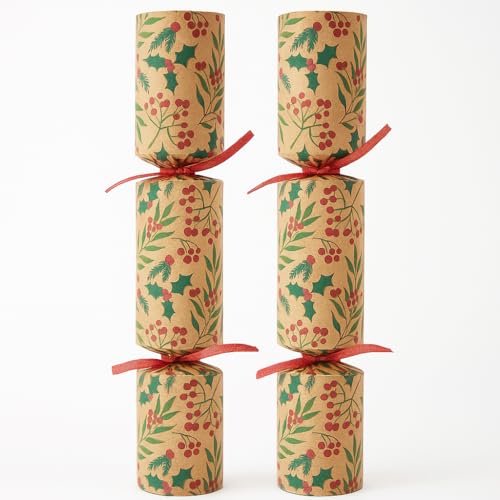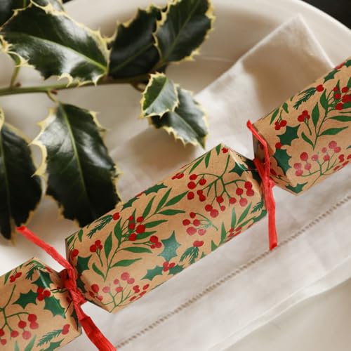 - FESTIVE DESIGN: Beautiful rustic brown paper kraft crackers with holly and berry pattern in traditional red and green and white frosted accents, perfect for creating a classic or neutral Christmas table setting