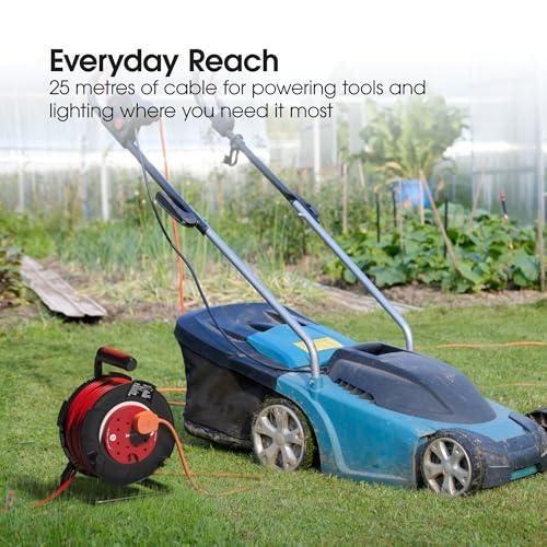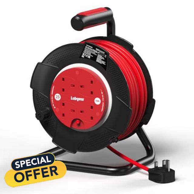 - ✔️ 25M PRACTICAL REACH: Offering a generous 25 metres of heavy-duty cable, this Labgear power reel gives you the flexibility to work further from your power source, ideal for garage, garden, or renovation use where dependable reach is essential.