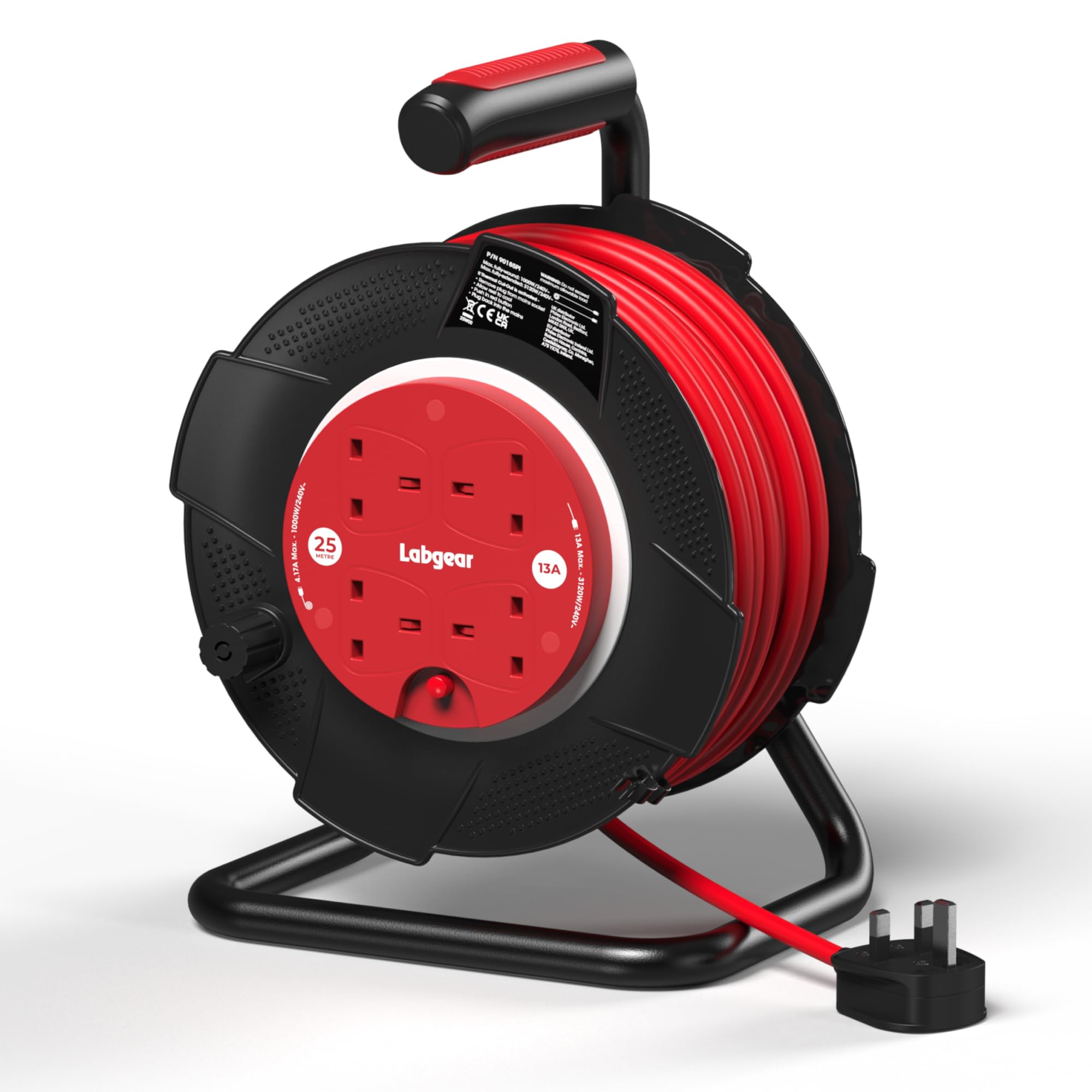 Labgear Extension Lead 25m Heavy Duty Cable Reel 4 Socket 13A Power Reel with Thermal Cut-Out Protection, Durable Drum and Carry Handle Black/Red