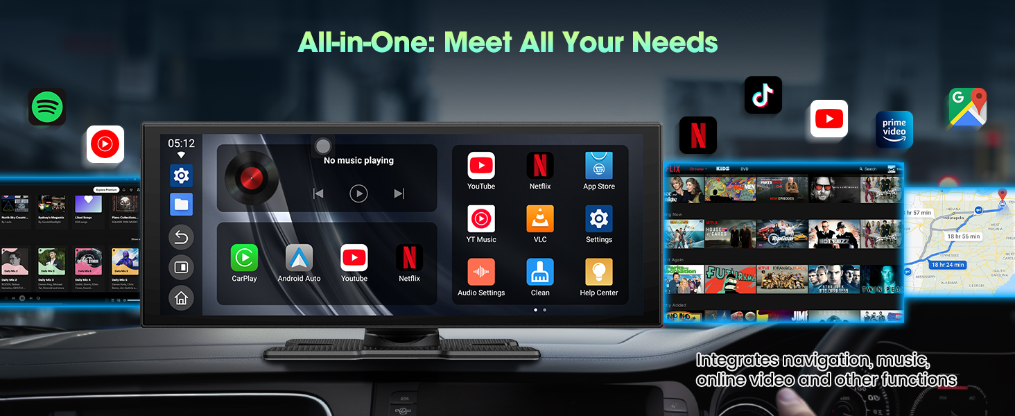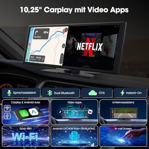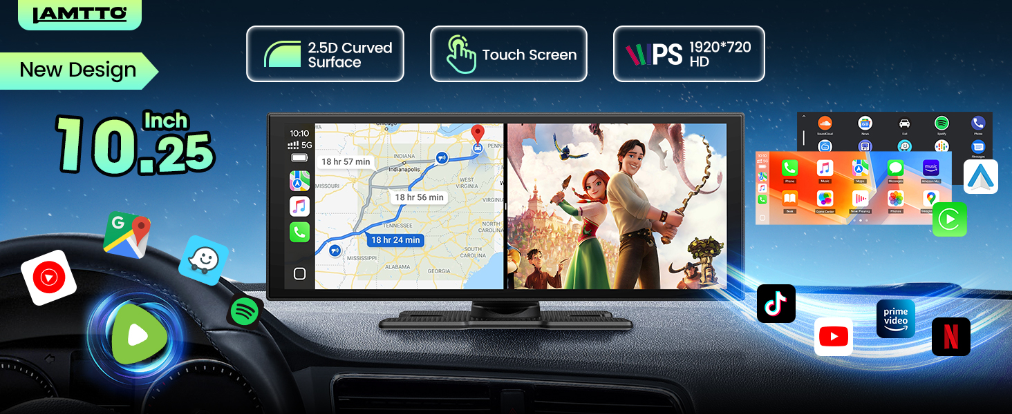 - 【 & : – 】 The LAMTTO 10.25-inch car display now supports wireless CarPlay and Android Auto, with an exciting upgrade: integrated Netflix and YouTube. Enjoy your favorite shows while staying connected with seamless navigation, voice assistant, and hands-free calls — all in one smart, entertaining interface