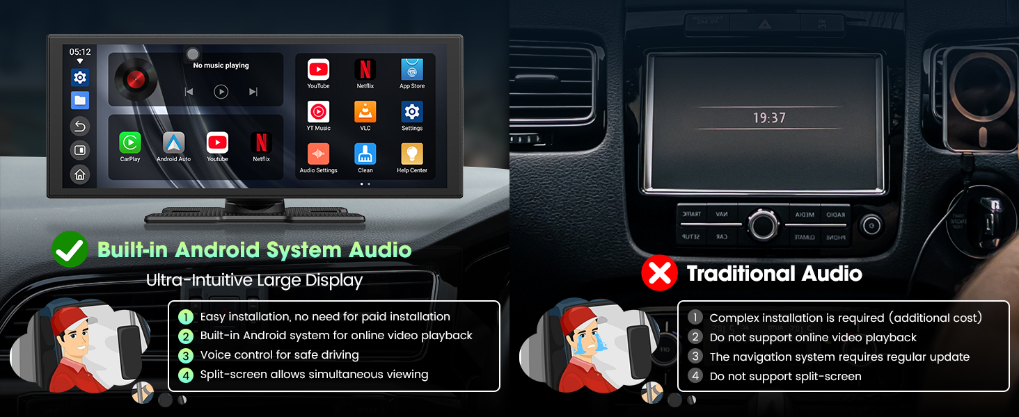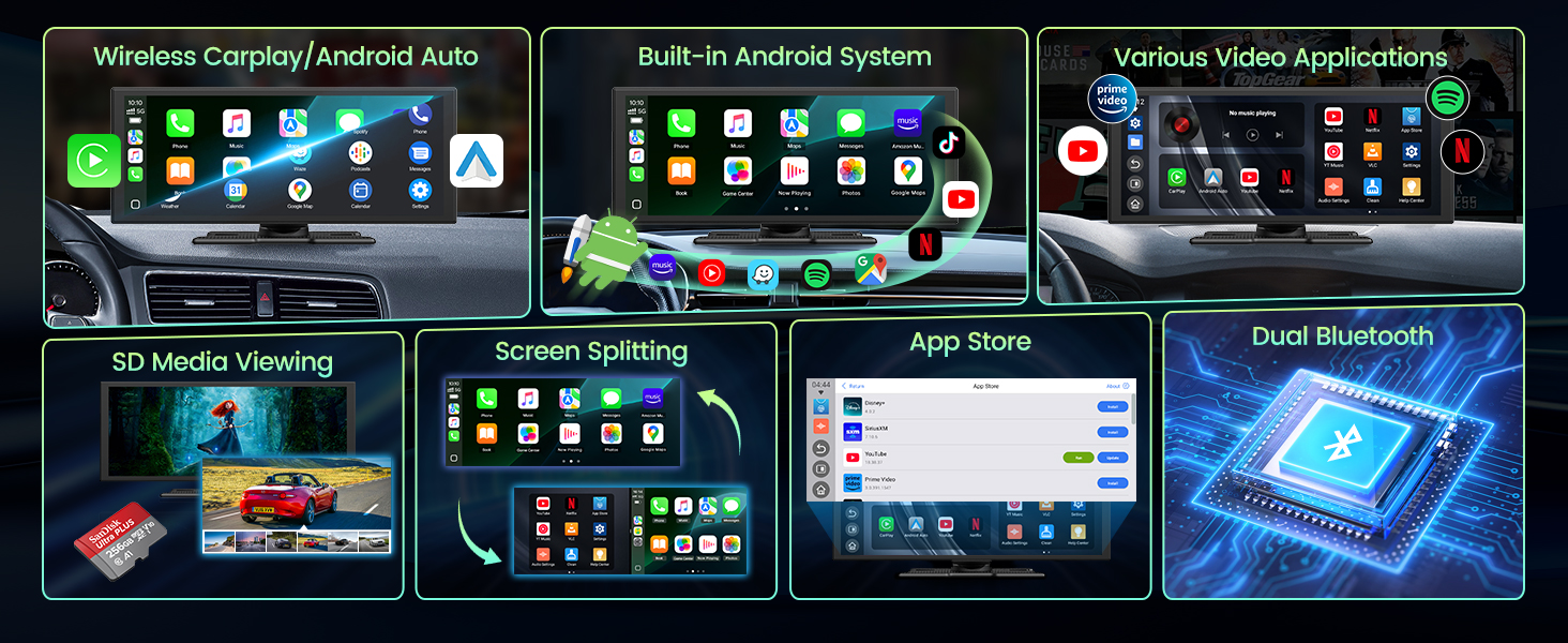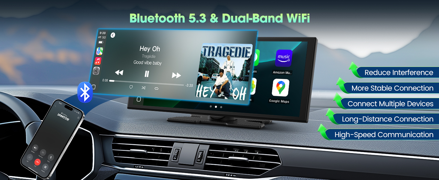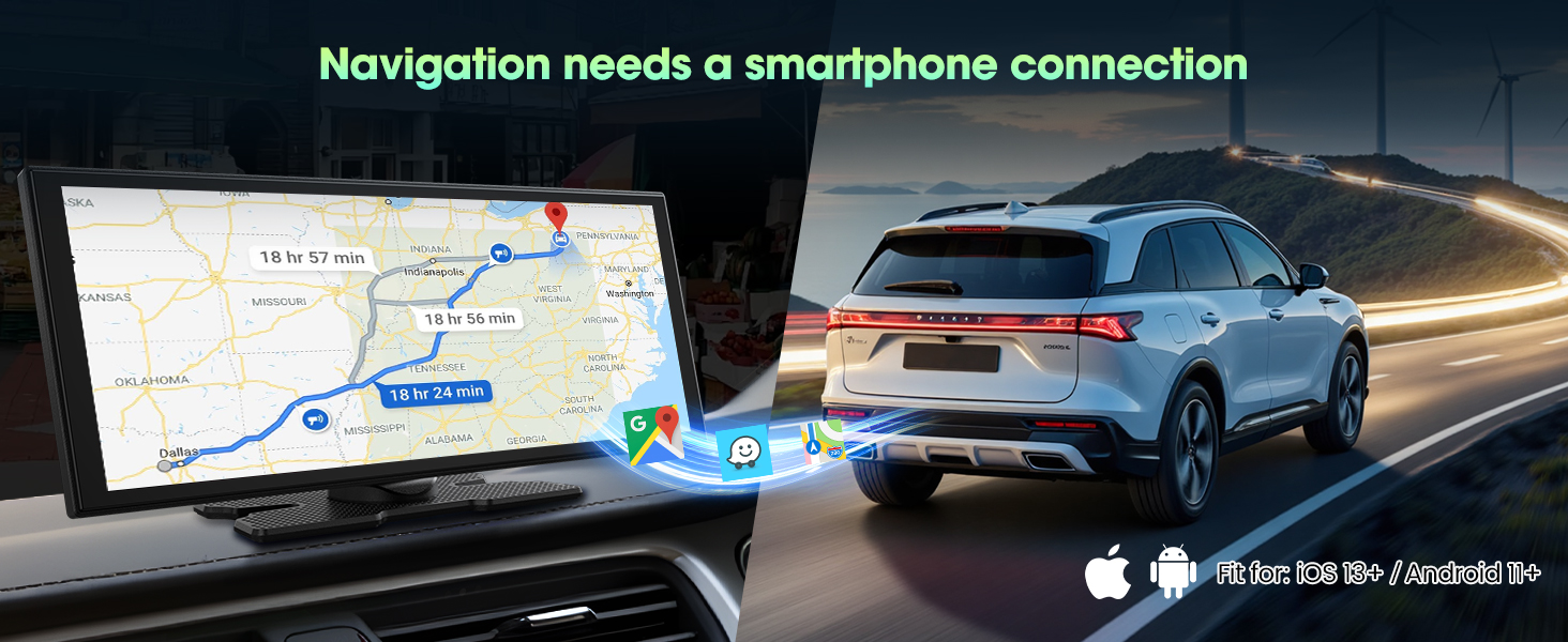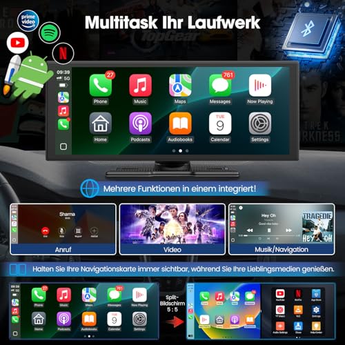 - 【 – & – 】 Say goodbye to buffering and weak signals. With dual-band WiFi, your wireless Apple CarPlay navigation stays seamless even while streaming HD video. The innovative split-screen feature lets the driver follow directions safely while the passenger enjoys movies or shows — keeping everyone content and the journey uninterrupted