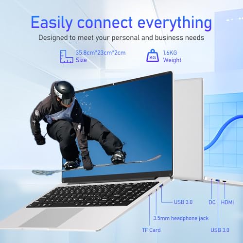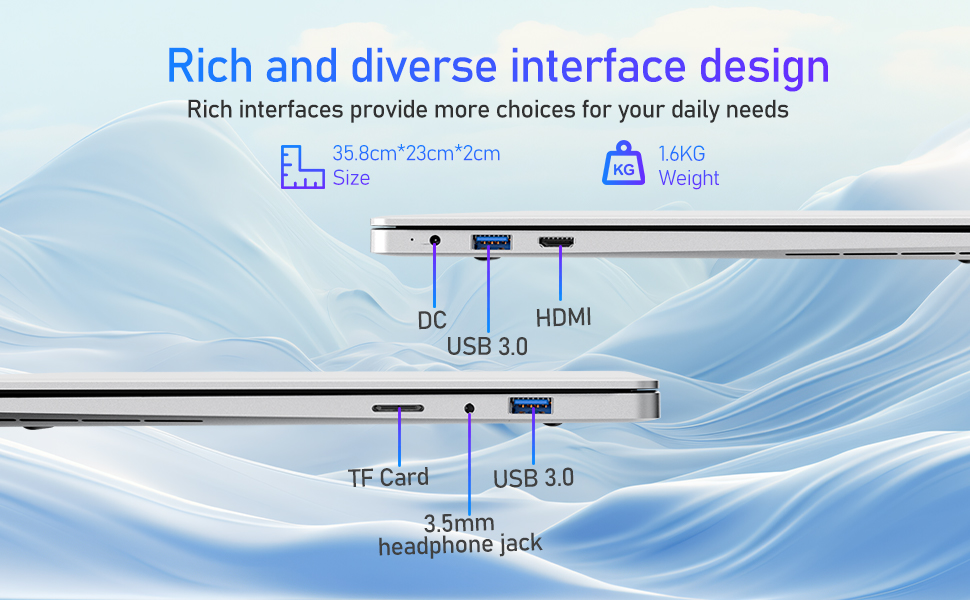【Lightweight Thin Body & Rich Interfaces】 This 15.6inch laptop adopts an ultra-thin body design, weighing only 1.6kg and 2cm thick. The Win11 laptop also equipped with 2*USB 3.0(data transmission is fast and efficient), 1*Mini HDMI, 1*3.5 mm standard headphone jack, 1*Micro TF, 1* 3.5mm DC ports. With these interfaces to meet your needs of connecting multiple peripheral devices in various work and entertainment scenarios.