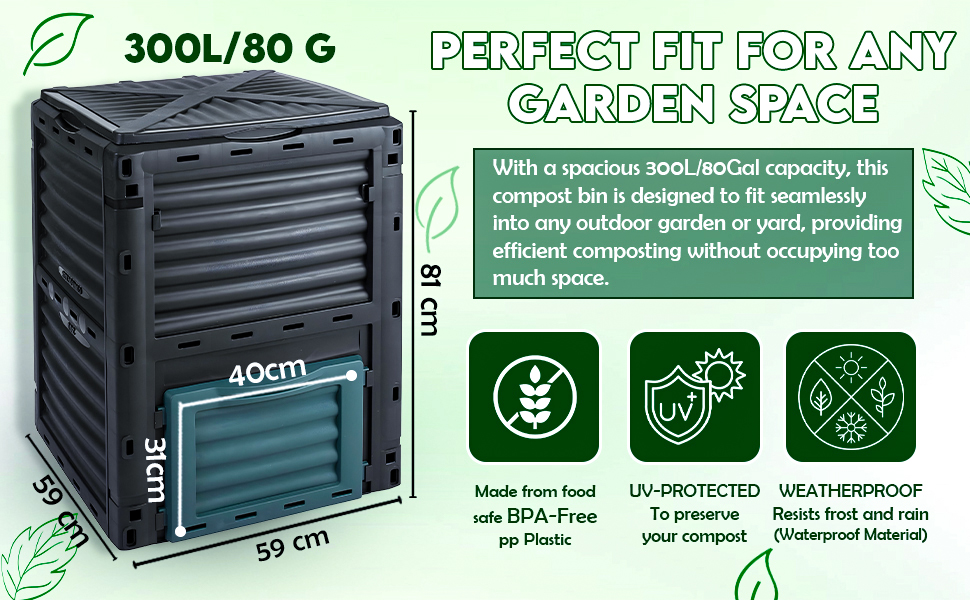 300LITRES – This sizeable compost bin can hold up to 300 litres of waste, so you will never have to worry about running out of compost again.
