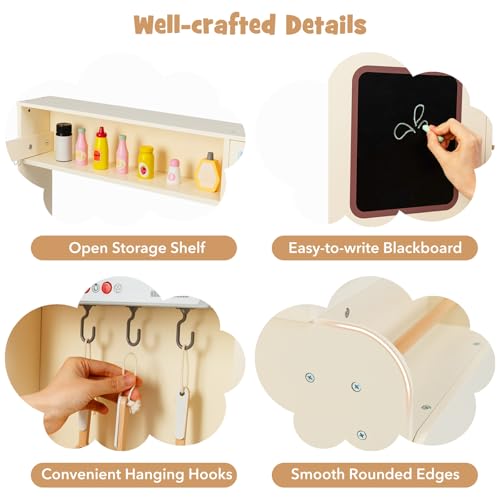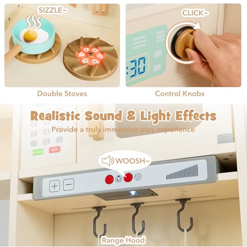 Real Culinary Experience: The wooden kitchen features impressive sensory effects, with authentic lights and sounds integrated into the range hood and double stoves. This design turns every play session into an immersive and fun experience that stimulates the senses of young chefs.
