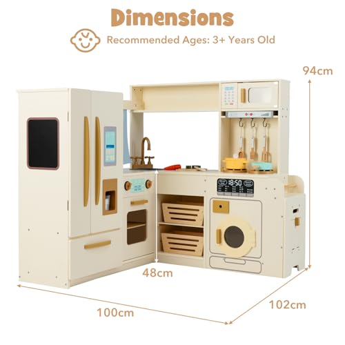 Large Kids Corner Kitchen, Wooden Children Role Play Kitchen Set with Lights & Sounds, Fridge, Ice Maker, Trash Can, 22 Accessories, Toddler Pretend Kitchens Toy for 3+ Years Old (Beige)