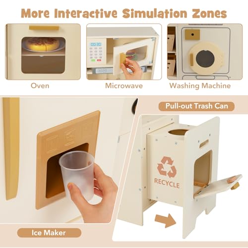 Multiple Play Areas: This children toy kitchen has a refrigerator, trash can, oven, microwave, washing machine, and a wipeable blackboard. All these functions are designed to mimic daily activities and stimulate children's creativity and coordination.
