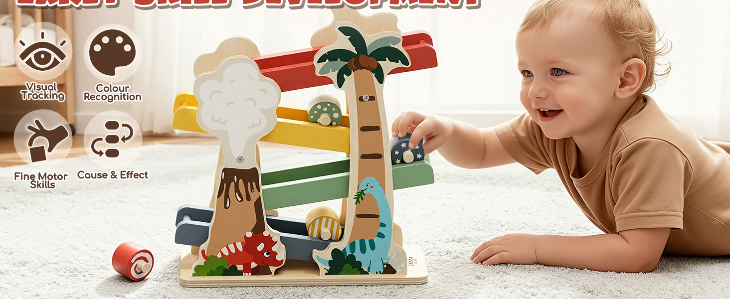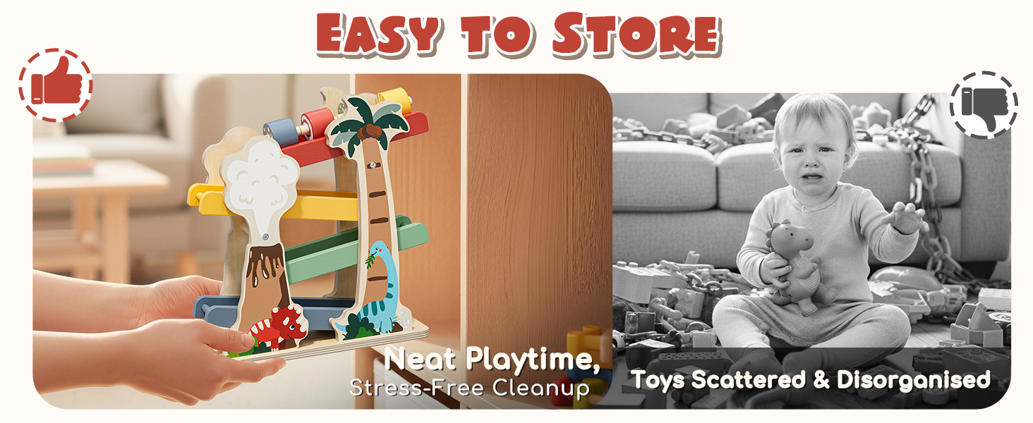 【Engaging Dinosaur Theme with Easy Storage】Step into a prehistoric world of fun! The colourful dinosaur design captures attention and sparks imagination. When playtime ends, all balls can be stored neatly on the ramp, keeping the space tidy and making clean-up quick and easy for parents.