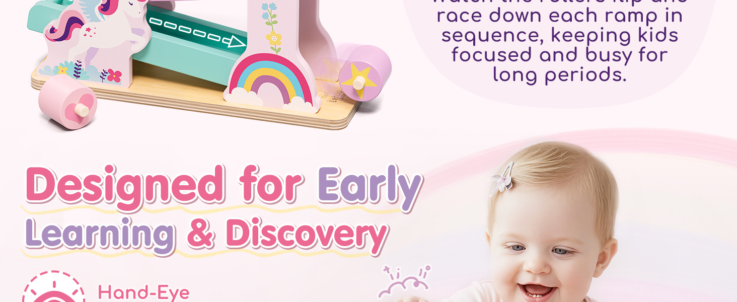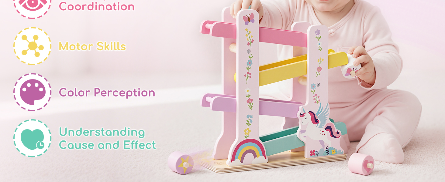 【Charming Unicorn Theme with Easy Storage】Decorated in soft pastel tones with delightful unicorn and rainbow patterns, this toy adds a magical touch to every playtime. When play is over, the balls can be neatly stored on the track, keeping your little one’s play space tidy and organised.