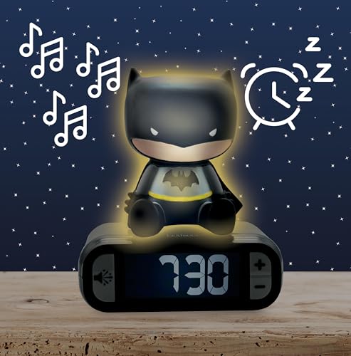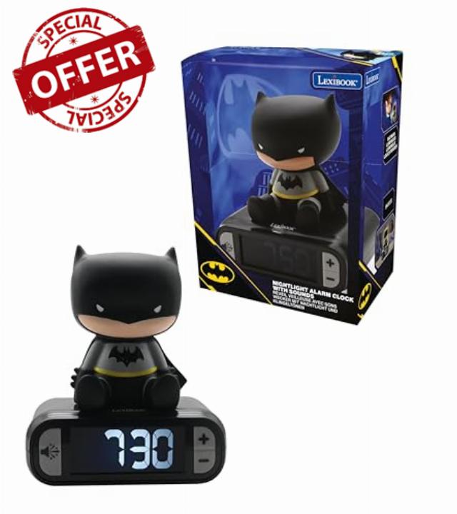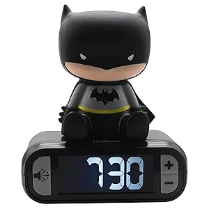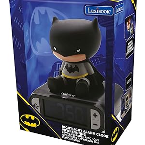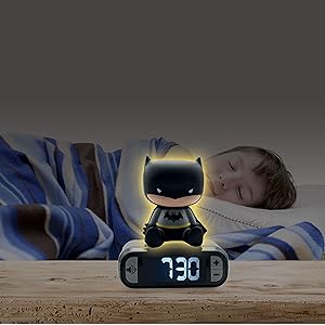 An alarm clock with a super cute design with batman lighting up for a few minutes when your press on it.