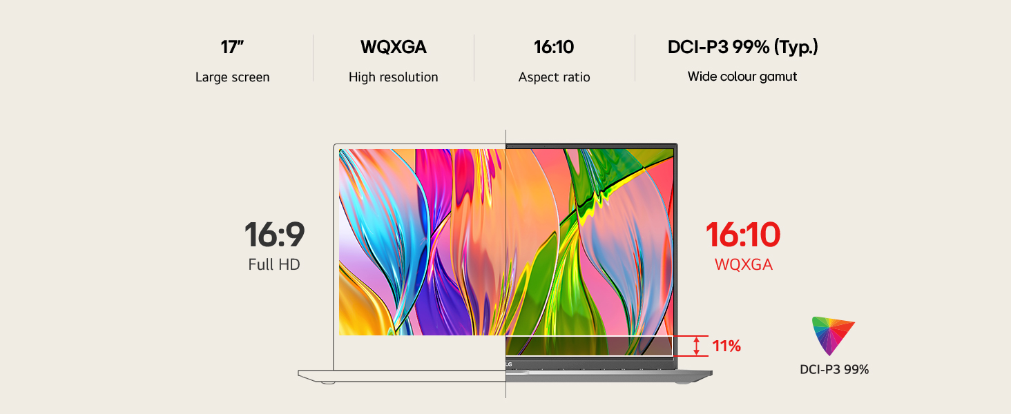 Unleash creativity with LG gram 16. Its 16:10 screen offers vivid DCI-P3 99% (Typ.) colours, 400nits (Typ.) brightness. The anti-glare panel ensures clear, vibrant views from any angle.