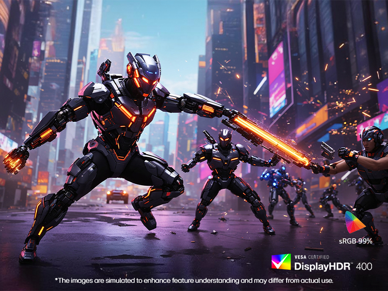 Our gaming monitor supports a wide coluor spectrum, 99% sRGB (Typ.) coverage, expressing high-fidelity colour for reproducing with VESA DisplayHDR 400, enabling a realistic gaming experience.