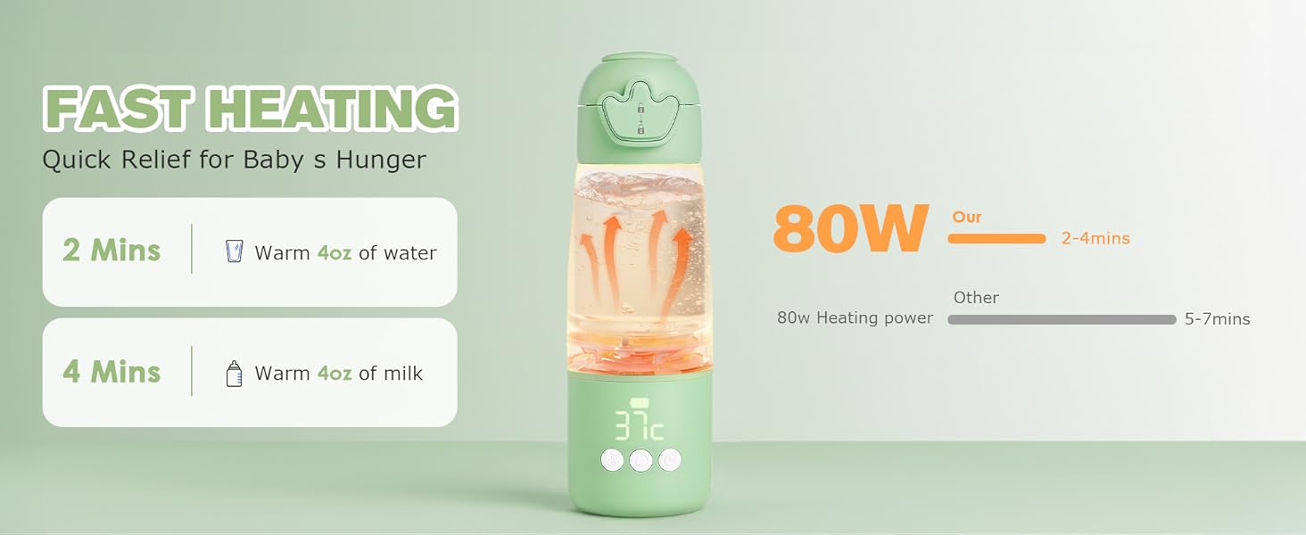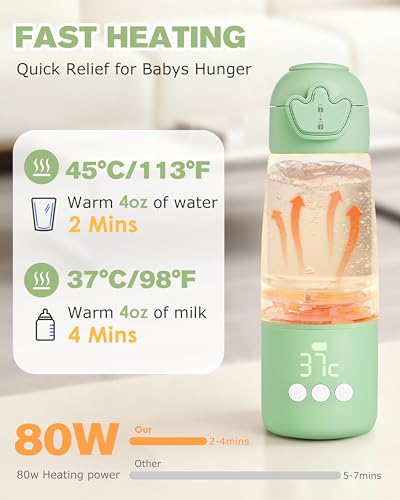 - Fast Heating, Instant Comfort :This portable milk warmer can warm 4oz of water to 113°F(45°C) in just 2 minutes or breast 4oz of milk to 98.6°F(37°C) in 4 minutes, delivering a perfect feed when your baby needs it most.Whether in a moving car, on a journey, or beside the bed at night, it can soothe a crying baby anytime, anywhere