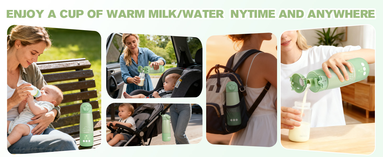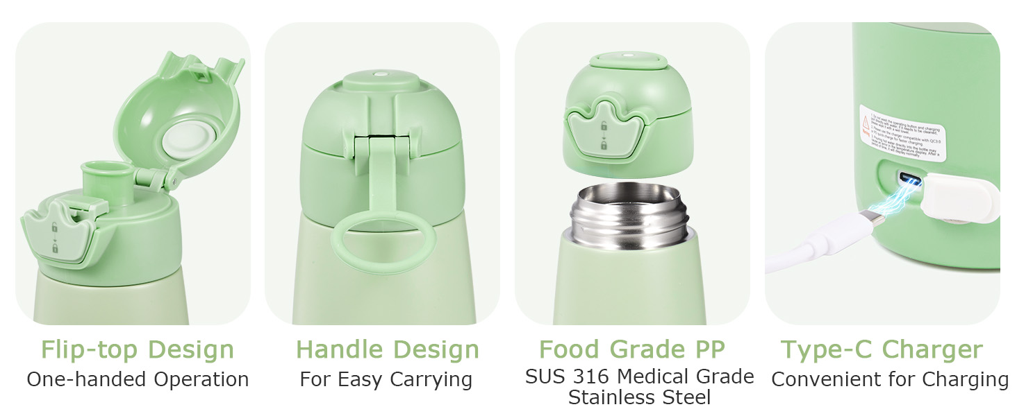 - Food-grade materials, easy clean design: This portable bottle warmer travel features a 316 stainless steel inner tank paired with food-grade PP/ABS/silicone components, ensuring pure taste for direct drinking or spill-proof pouring.