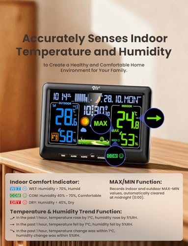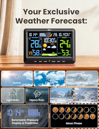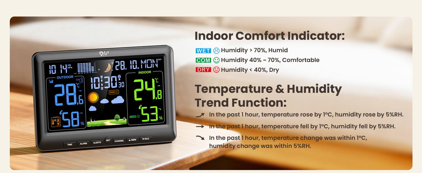 Multifunctional Home Weather Station -The weather station includes multiple functions for detecting indoor and outdoor temperature & humidity, radio controlled clock, time, moon phase, weather forecast and trend, barometer, humidity monitor, etc.