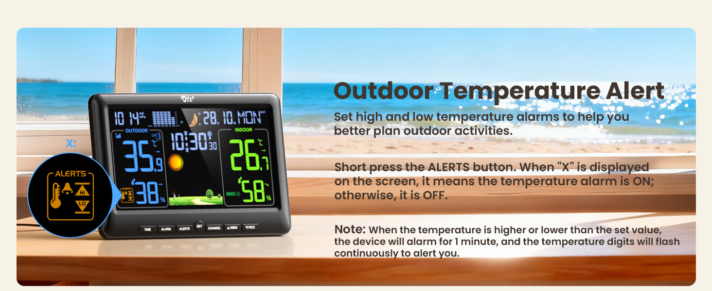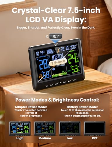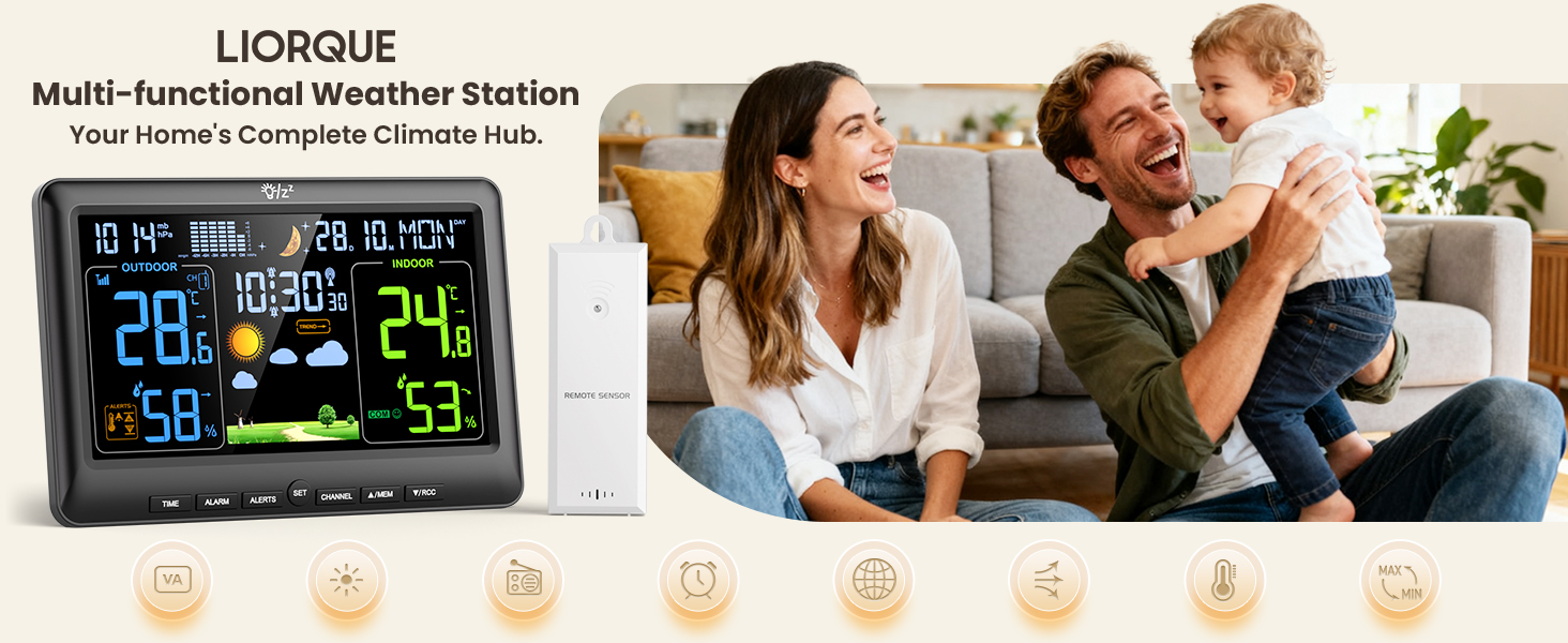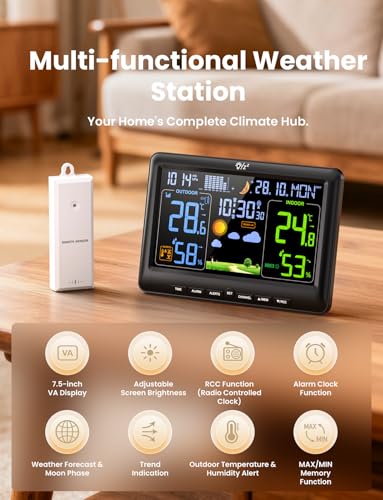 Large LCD VA Display – LIORQUE wireless weather station features a 7.5-inch large LCD VA screen for easy readability. Weather station with portable size can be put anywhere with tabletop or hang it on the wall with eyelet. Not only a weather thermometer, but also an alarm clock for bedroom, kitchen, office, etc.