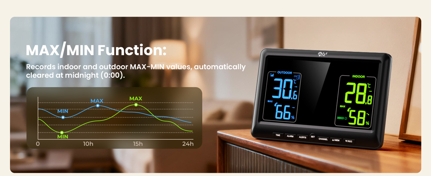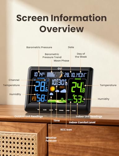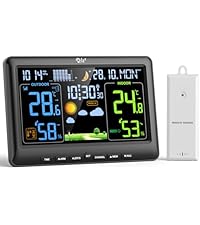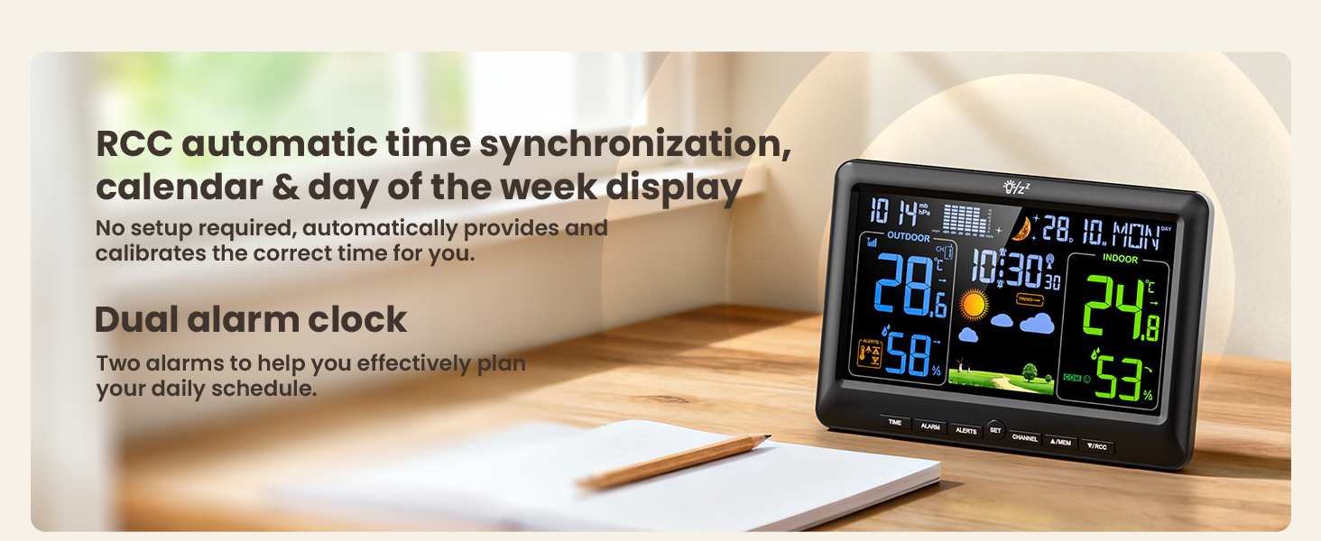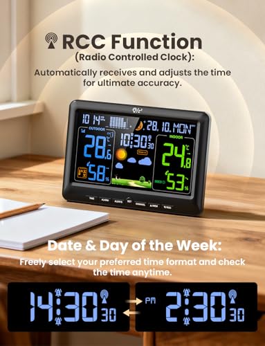 Radio Controlled Clock -The weather station has RCC function, automatic time change for Spring & Autumn and automatic time checks. 12/24 h time display with calendar, weekday(7 languages), alarm clock(two & snooze(5-minute snooze time),suitable for any where you using.