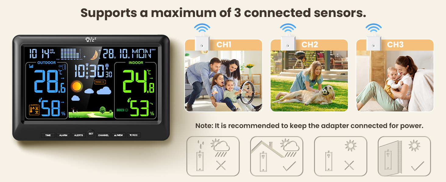 Support Up to 3 Sensors – The LIORQUE weather station supports up to 3 outdoor sensors(only 1 outdoor sensor included in the package), with a sensing distance of 100 meters/328 feet. The package includes: 1 x weather station, 1 x outdoor sensor, 1 x adapter, 1 x user manual