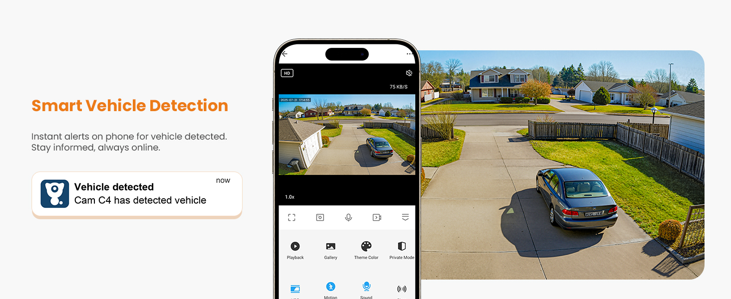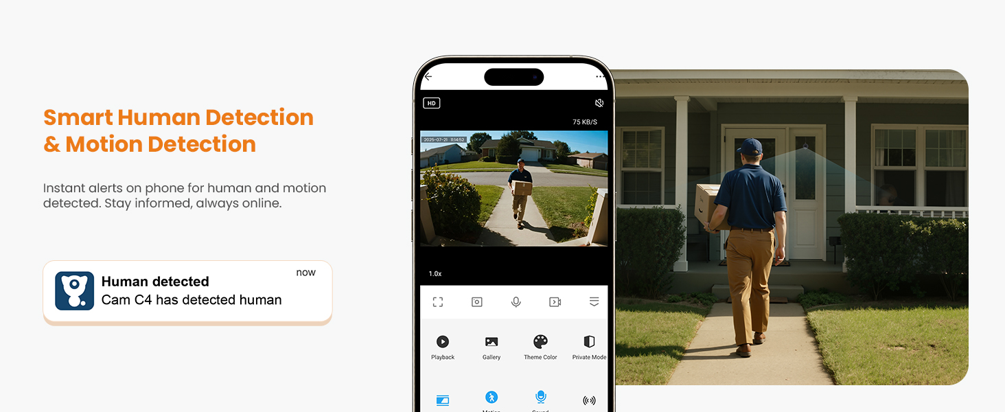 [Smart Detection & Real-Time Alerts] Unlike other window cameras, this indoor window camera is equipped with precise human shape, motion, and sound detection technology. It sends real-time alerts to your phone only when it detects truly significant activity. This powerful window cameras for home security allows you to monitor the real-time situation in front of your home anytime, anywhere, ensuring you never miss any important moments.