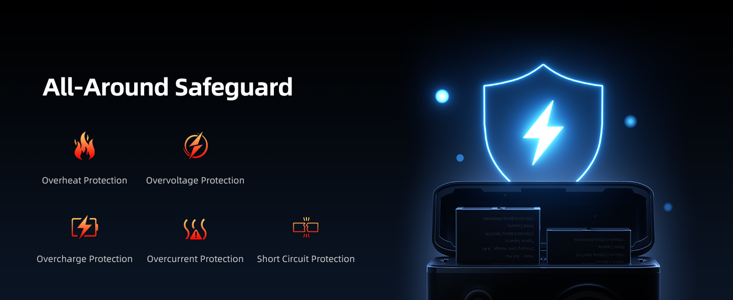 - Safety and Reliability: Your safety is our priority. Built-in advanced safety features ensure the protection of your camera and batteries during both charging and use.
