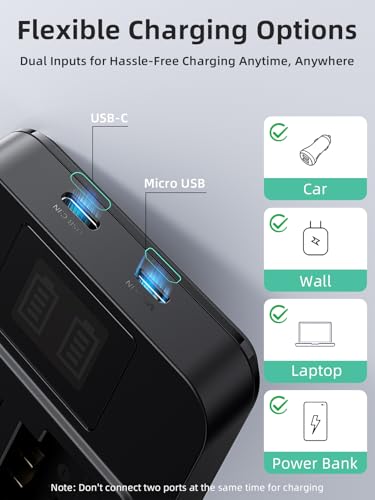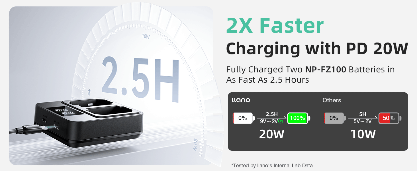 - [PD 20W Ultra-Fast Charging] Experience blazing fast 20W charging with 9V⎓2A input—recharge two a7iii batteries in just 2.5 hours, 50% faster than standard 10W a7iii battery chargers. Built for everyday creators and casual shooters who value speed and convenience.