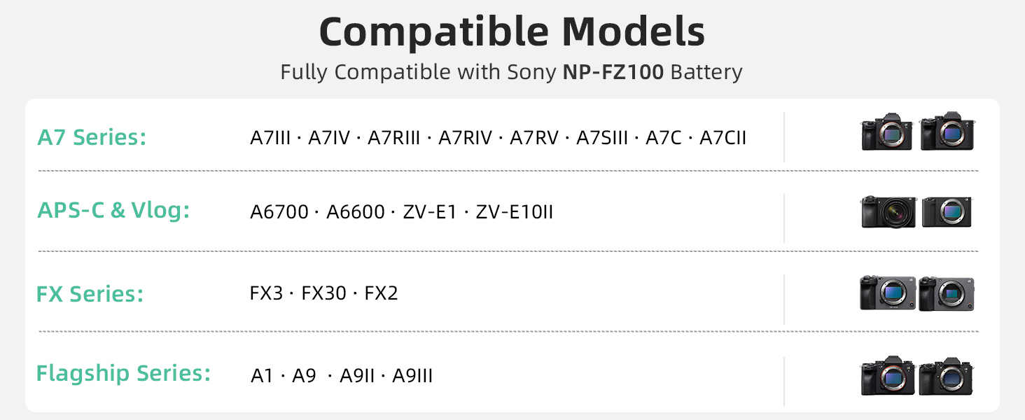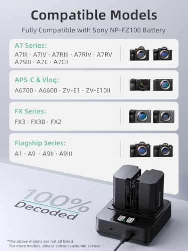 - [100% Compatible with Sony NPFZ100 Battery]llano np-fz100 battery charger set ensures no firmware errors, accurate in-camera power display, and full OEM function support.Works with Sony A7IV, A7III, FX3, FX30, A9, A9II, A9III, A1, A7RV, A7RIII, A7C, A7CII, A6700, A6600, ZV-E1, ZV-E10II and FX2.