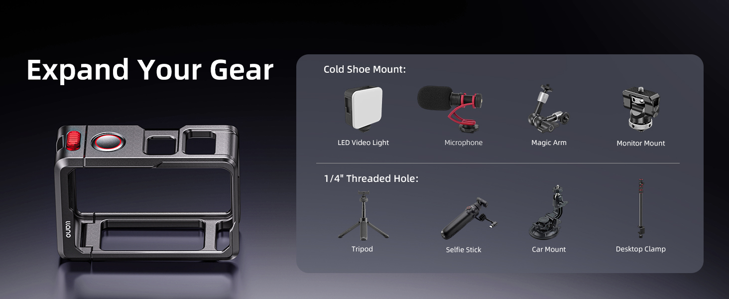 Expand Your Creativity with Multiple Mounts:Equipped with a cold shoe mount and 1/4"-20 screw holes, the llano cage supports external accessories like microphones, fill lights, tripods, or magic arms—ideal for vloggers, bikers, and outdoor creators.