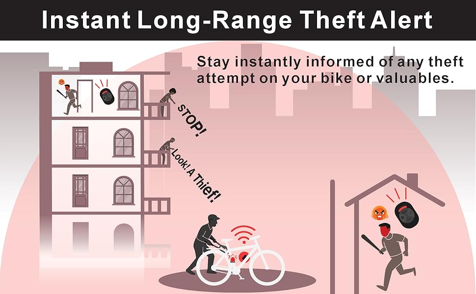 Guardian Alarm uses a low-frequency signal with superior reach and strong ability to pass through obstacles, plus better noise resistance than Bluetooth or Wi-Fi. This allows it to work through walls and multiple floors in tall buildings. During a theft attempt, the device sends multiple alerts to ensure the notification reliably reaches your remote.