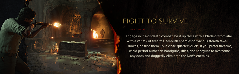 - FIGHT TO SURVIVE Engage in life-or-death combat, be it up close with a blade or from afar with a variety of firearms. Ambush enemies for vicious stealth takedowns, or slice them up in close-quarters duels. If you prefer firearms, wield period-authentic handguns, rifles, and shotguns to overcome any odds and doggedly eliminate the Don's enemies.