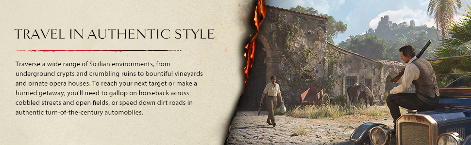 - TRAVEL IN AUTHENTIC STYLE Traverse a wide range of Sicilian environments, from underground crypts and crumbling ruins to bountiful vineyards and ornate opera houses. To reach your next target or make a hurried getaway, you'll need to gallop on horseback across cobbled streets and open fields, or speed down dirt roads in authentic turn-of-the-century automobiles.