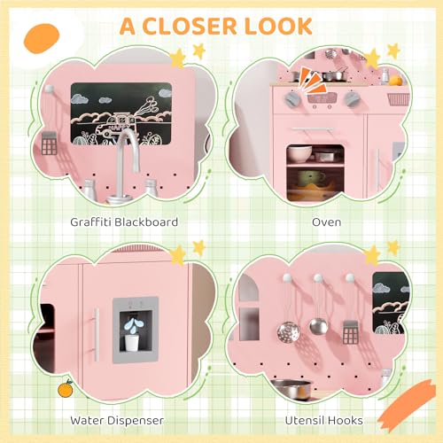 Interactive Features: Kids kitchen includes a stove with sizzling sounds and lights (batteries not included), clickable knobs, a working water dispenser, faucet, 5-piece cookware set, and chalkboard—creating an engaging culinary play experience.