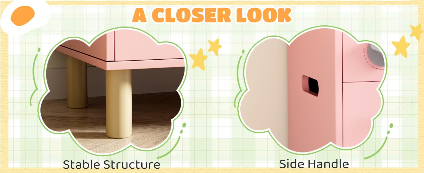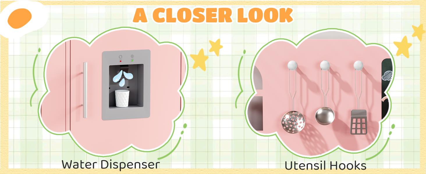 Smart Storage: With a storage cabinet and space behind the water dispenser, this play kitchen helps kids easily organize toys and cookware, encouraging tidiness and independence.