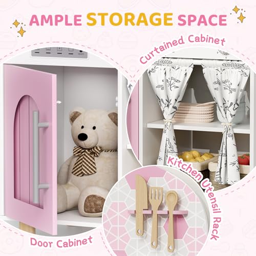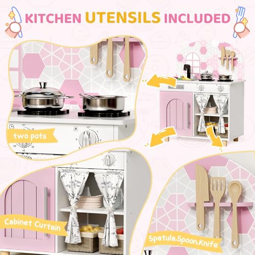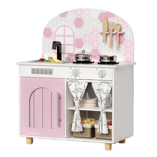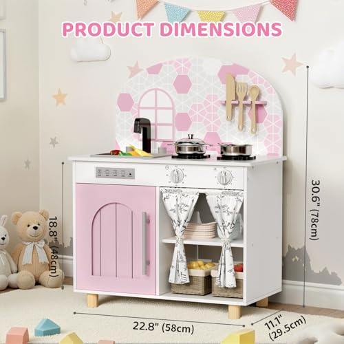 MAMIZO Wooden Play Kitchen with Real Sound, Children's Play Kitchens with kids kitchen 5 Pcs Accessories, Toy Kitchen for Age 3+, Simulated Gas Cooker, Clicking Knobs, Faucet, Storage Cabinets (Pink)