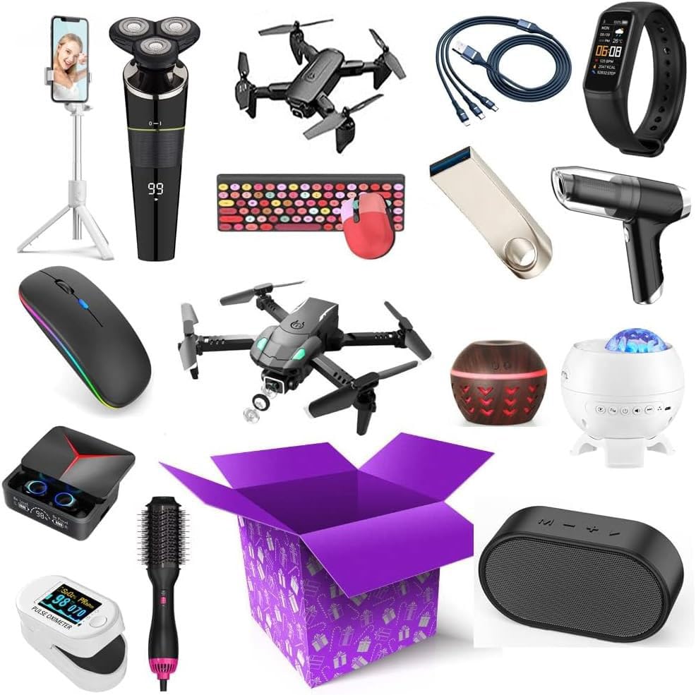 - Maxmystery_Electronic_Box, Gadget Bundle with Drone, VR Headset, Wireless Headphones, Smartphone, Camera and Mor