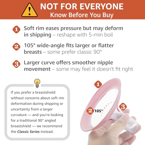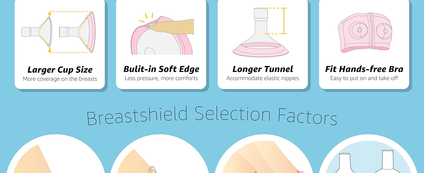 Flange opening is 105 degree, more suitable for mothers with large breasts or flatter contour breasts; Soft and flexible edge for more comforts; Larger cup size for more covered area of breasts during pumping; elliptical-shaped design to rorate and adapt for comfortable pumping.