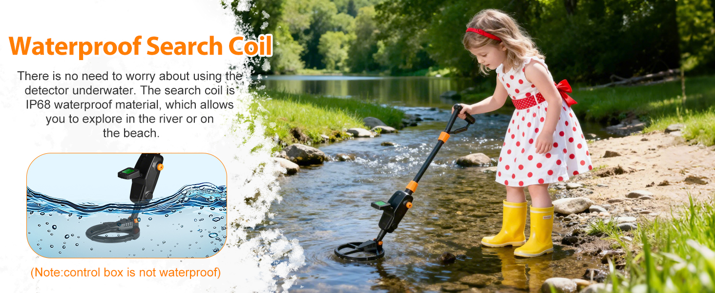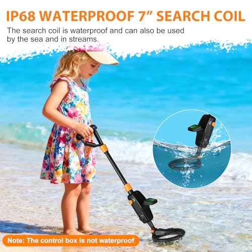 - IP68 WATERPROOF SEARCH COIL: Equipped with 7“ IP68 waterproof search coil, your curious kids can explore the beach, sand, and stream, also find treasures buried underwater. NOTE: THE CONTROL BOX IS NOT WATERPROOF!