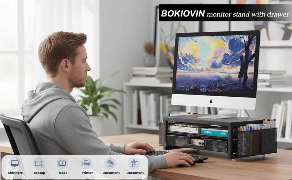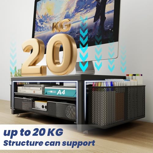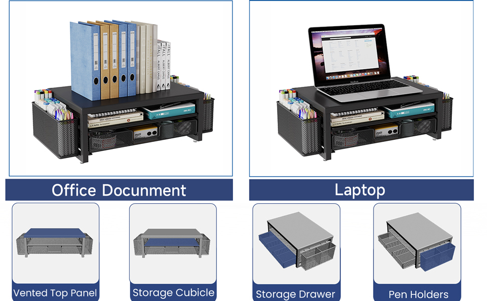 【Durable & Sturdy】:The desk monitor stand is made of carbon steel and quality metal mesh, sturdy, well made . Laptop stand with storage is classic matte-finished with baking paint to adding elegance and modernity to your office.