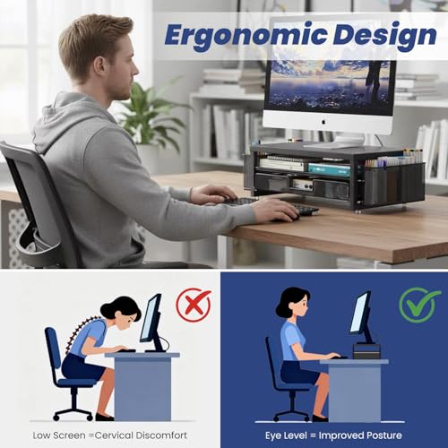 【Ergonomic Design】:Raise your monitor to a comfortable viewing height, reducing strain on your neck, shoulders, and back for increased comfort and improved productivity.
