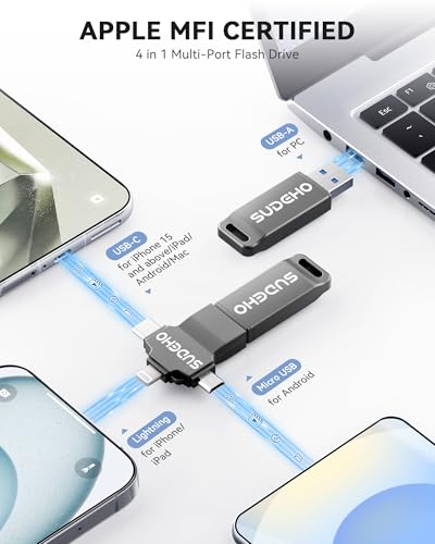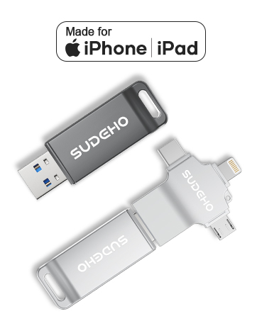 - Seamless 4-in-1 Design: The SUDEHO USB Stick pairs a solid USB-A plug with a detachable 3-in-1 adapter featuring Lightning, USB-C and Micro-USB connectors – giving you smooth access across multiple devices. Official MFi certification ensures dependable compatibility and stable performance with iPhone and iPad, while Android, PC and Mac are fully supported. Its compact, all-in-one body means no loose parts, no extra adapters, just seamless transfers anytime, anywhere.