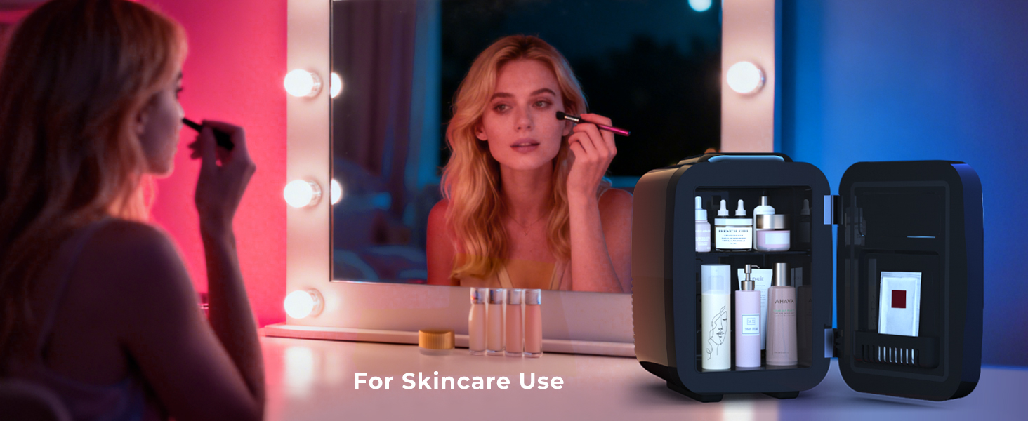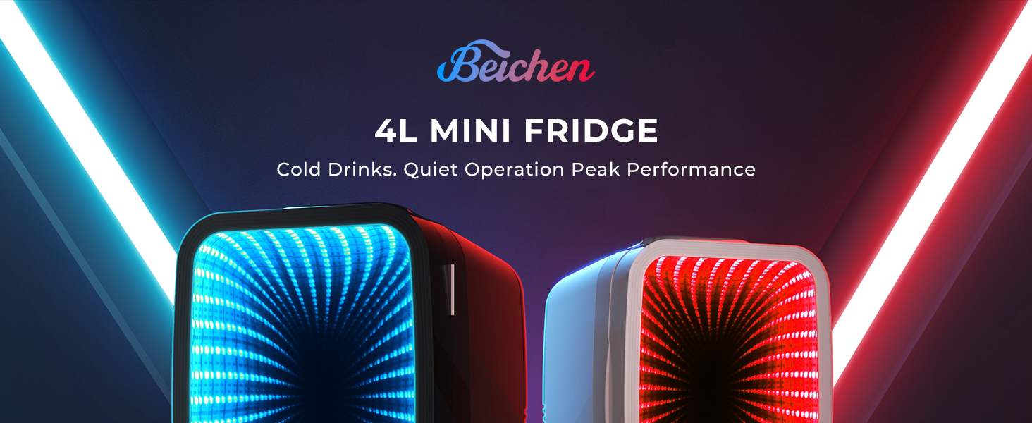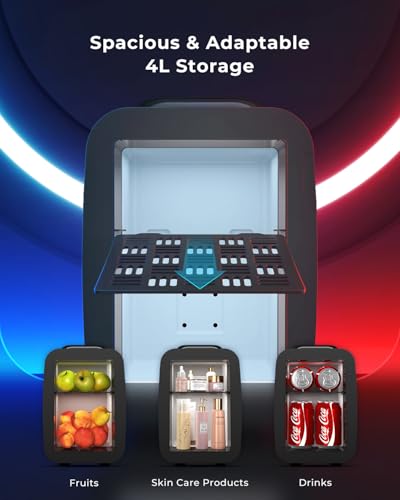COMPACT 4L CAPACITY: Don't let the size fool you. This mini fridge boasts a 4-litre capacity, smartly holding up to 6 cans (350ml). The interior size is 5.31×5.51×7.87 inches. The interior features an adjustable, removable shelf for customising space for tall drinks, skincare, or snacks. With its sleek design and touch-sensitive LED door, it's more than a small refrigerator; it's a stylish, functional statement piece for any bedroom, office, or dorm