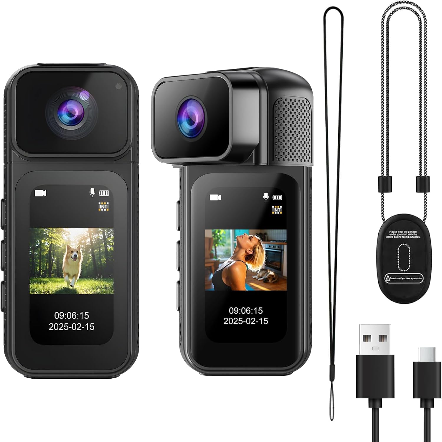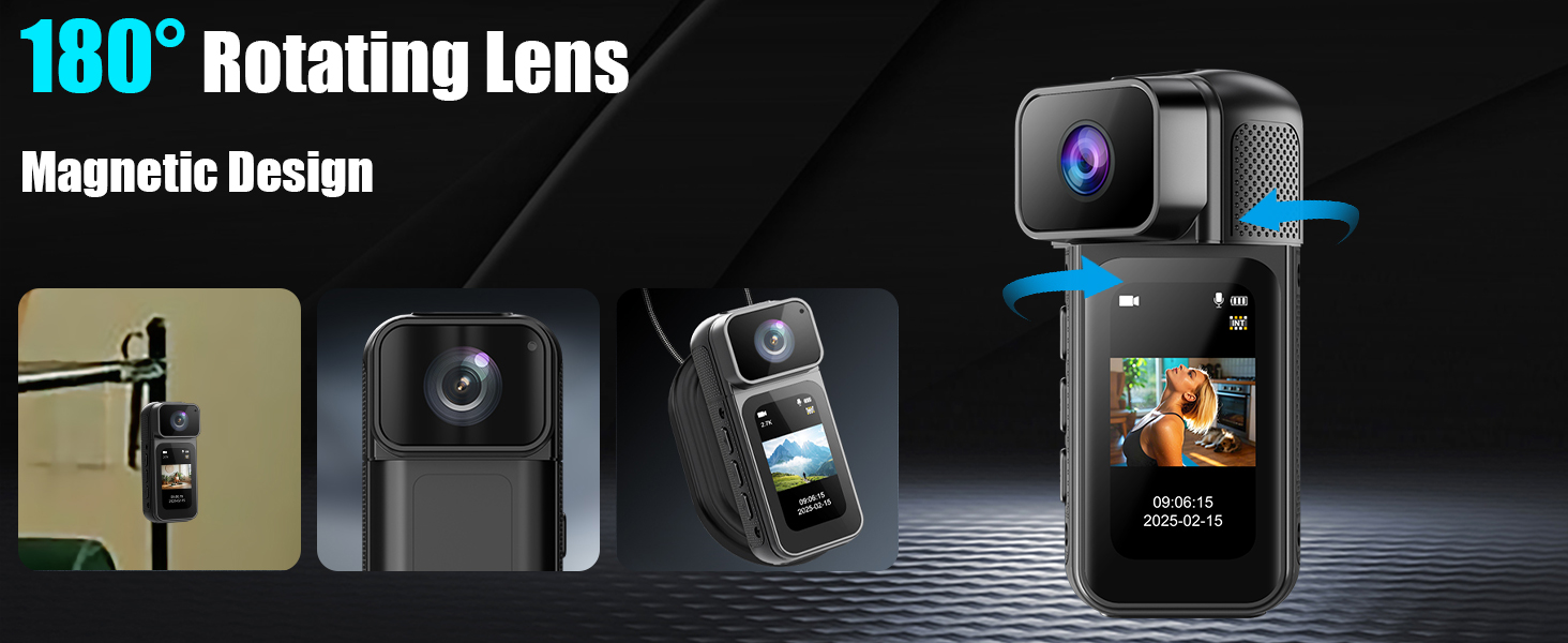 - 180° Rotating Lens: Features a flexible 180° rotating lens for effortless switching between front and rear perspectives, catering to diverse needs like vlogging, surveillance, or hands-free recording. Users can achieve precise framing without moving the device.