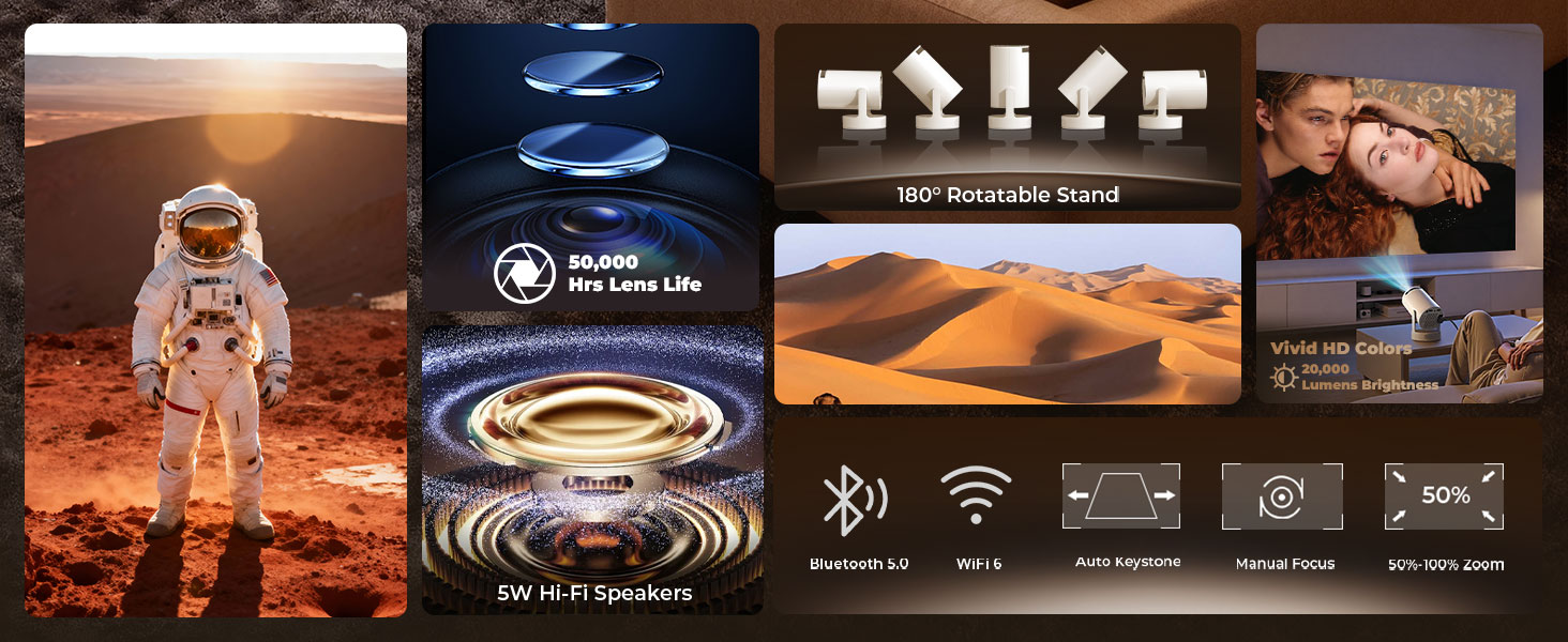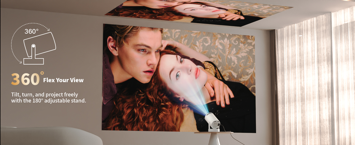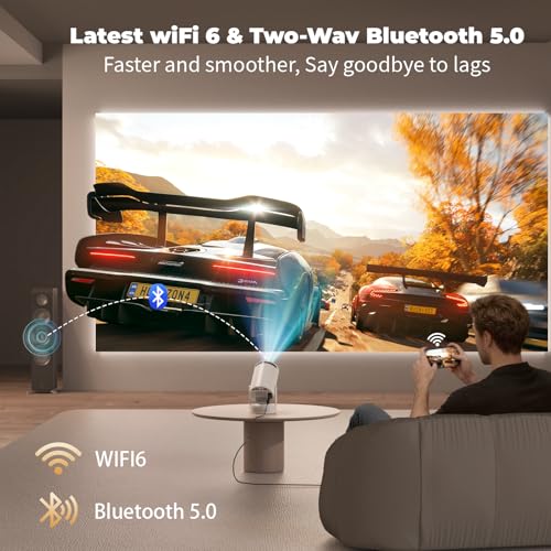 SMART CONNECTIVITY & FLEXIBLE DESIGN: This 4k projector supports WiFi 6 for smooth, low-latency streaming and Bluetooth 5.0 for connecting headphones or external speakers. The 180° rotating body design allows you to project on walls or ceilings for flexible entertainment anywhere at home.