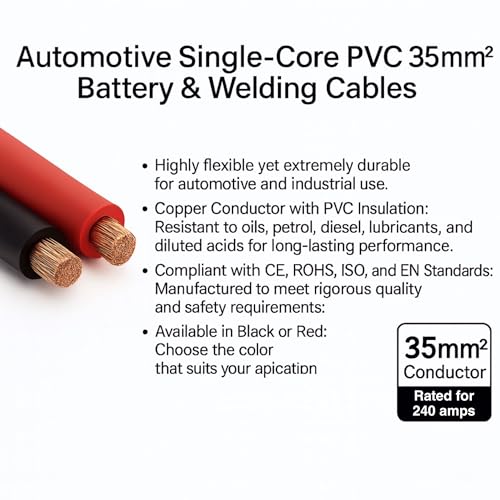 - Automotive Single-Core PVC 35mm² Battery & Welding Cables: Highly flexible yet extremely durable for automotive and industrial use.