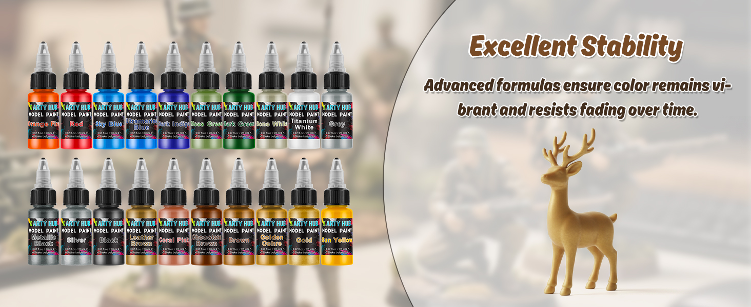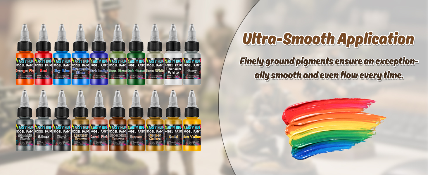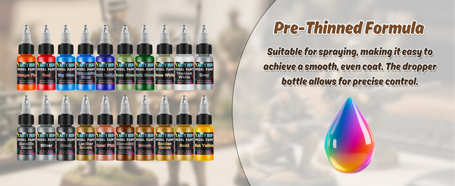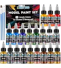 - Packing List: This model paint set includes 20 bottles model paint (20 ml each) and three paint brushes (two fine and one coarse). The dropper bottle design prevents drying and allows for precise, controlled application with less waste