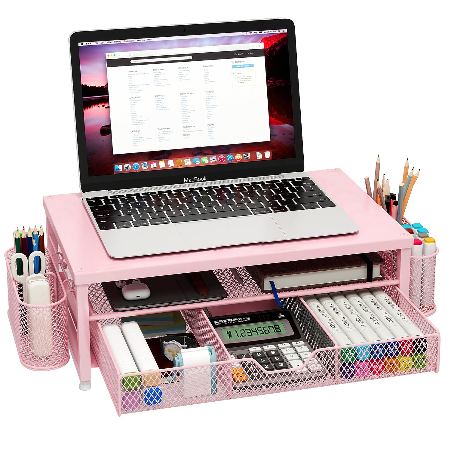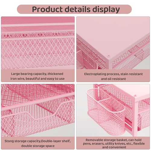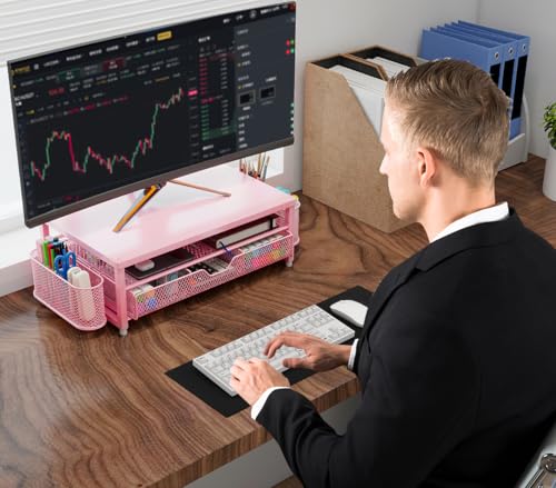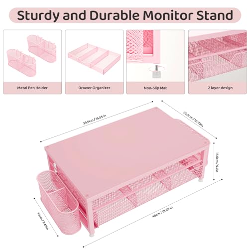 Monitor Stand Riser Metal, Office Desk riser with shelf Organizer, Office Organization ,Desk Organizer with Drawer and Pen Holder, 2-Tier Computer Stand, for iMac, PS4, PC, Printer, Notebook (Pink)