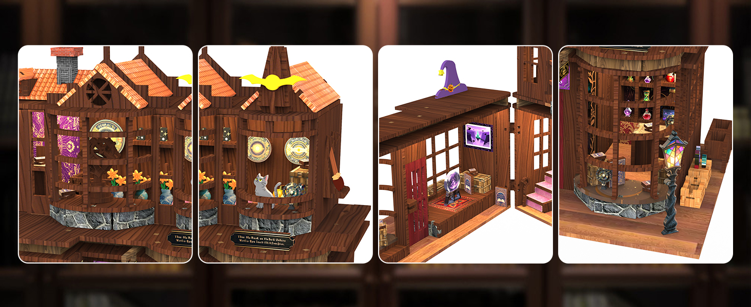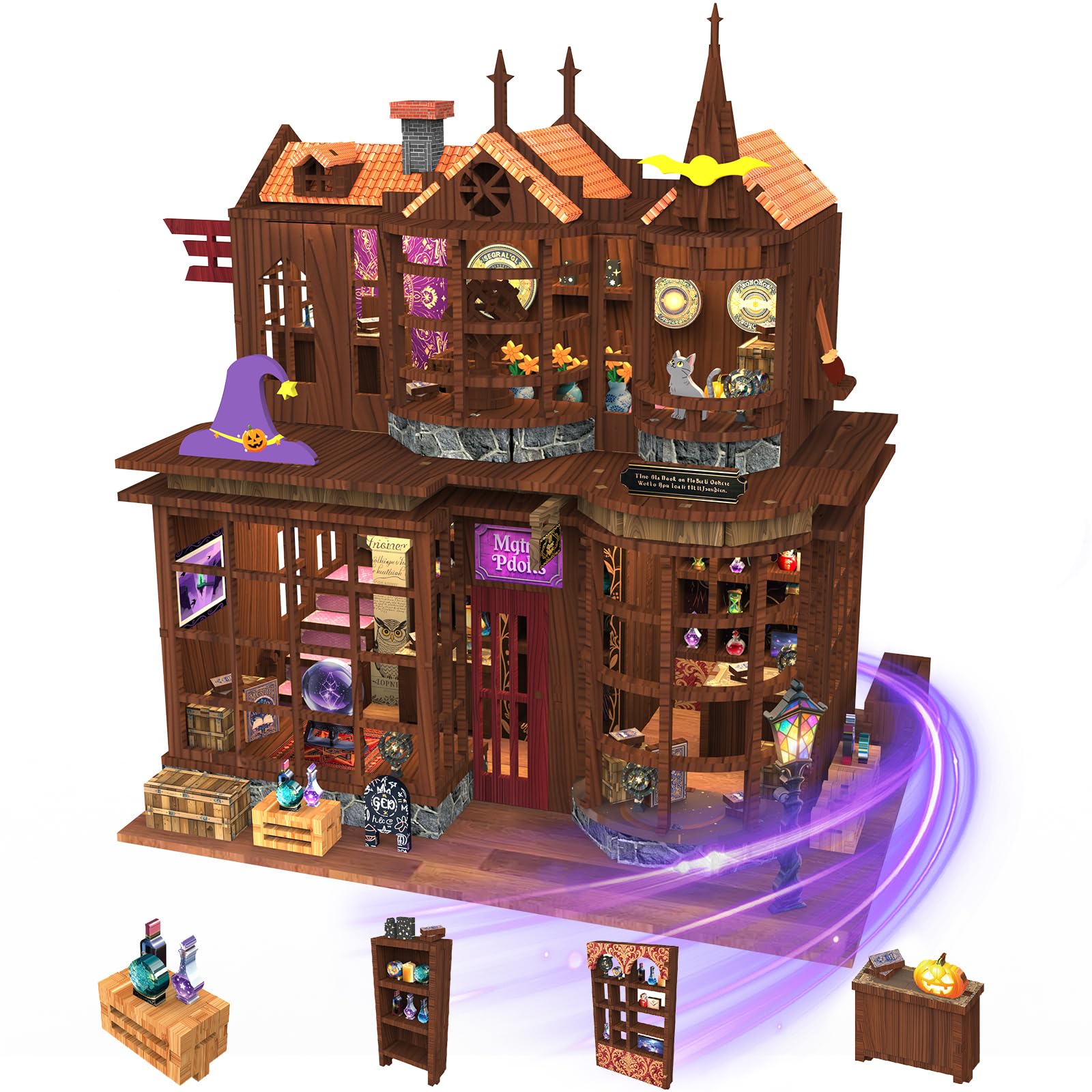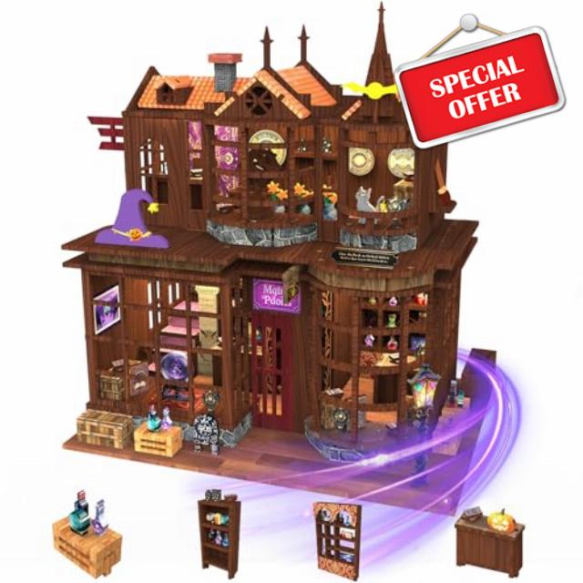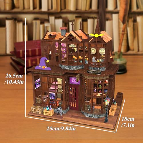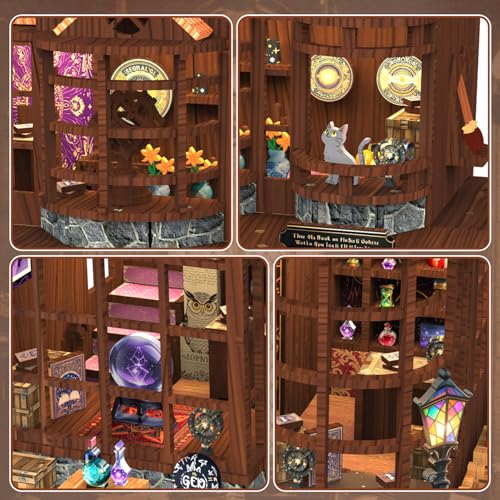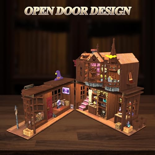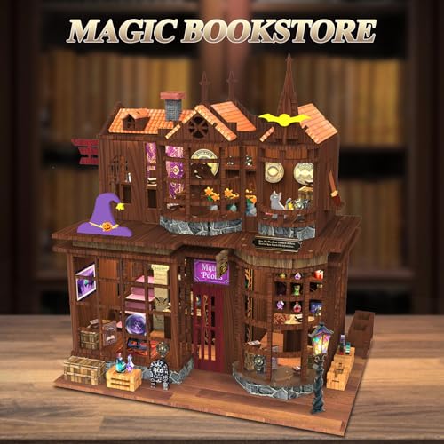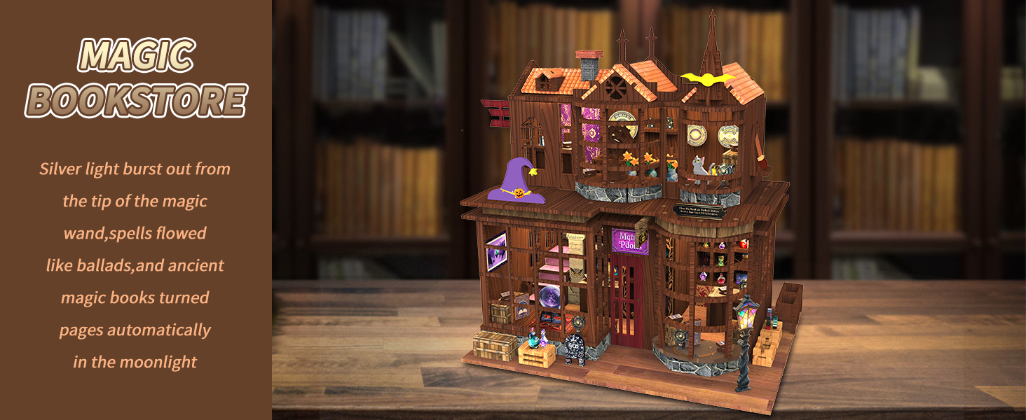 Special Design: DIY dollhouse magic bookstore themed mini house with interior design and super bright LED lights.Silver light burst out from the tip of the magic wand,spells flowed like ballads,and ancient magic books turned pages automatically in the moonlight.Let's explore the magic bookstore together