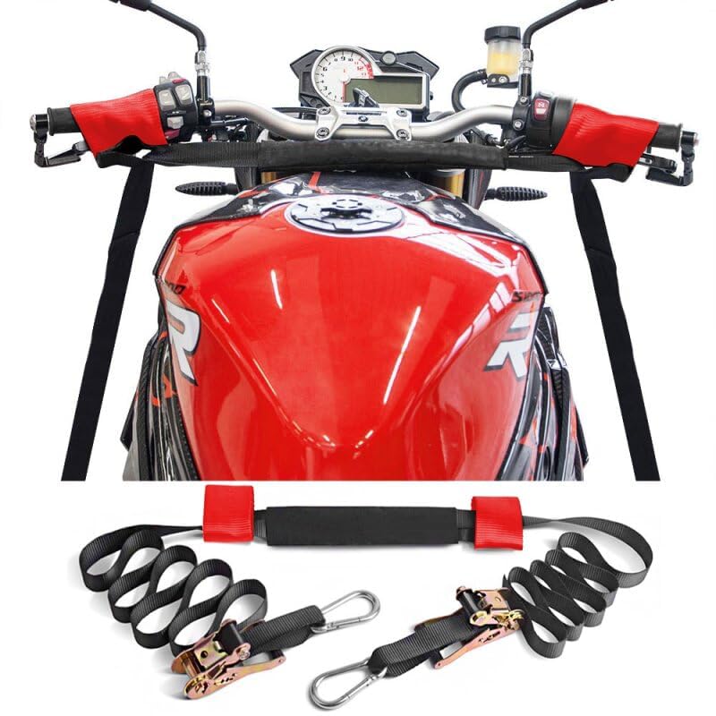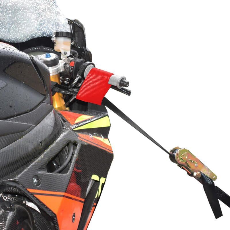 MOTO4U Universal Motorcycle Handlebar Tie Down Strap with Belt Tensioner Motorbike Front Wheel Tie Down Strap Front Wheel Transport Bar Tie Down in Red