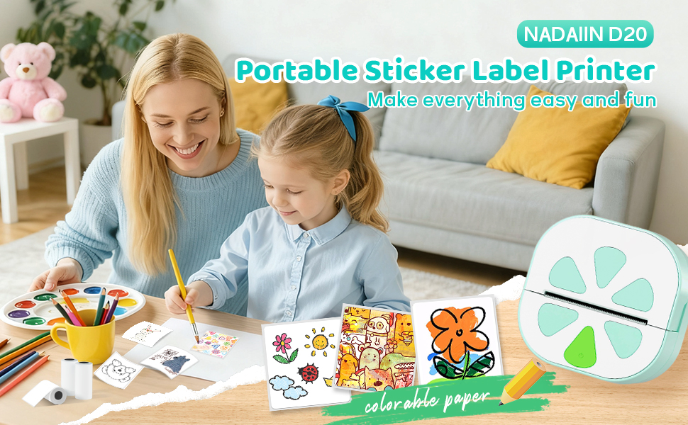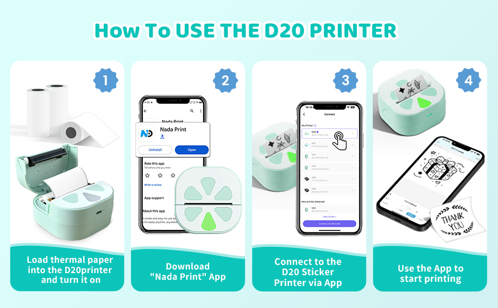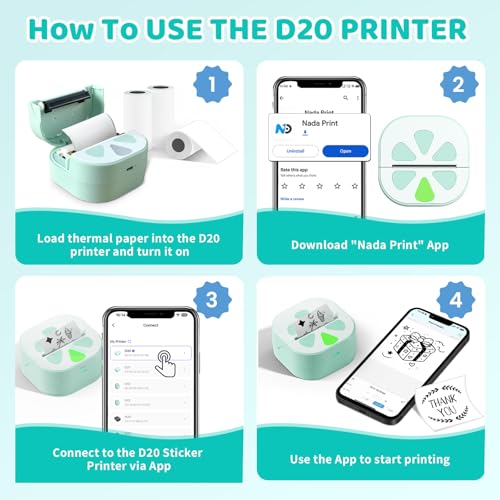 Portable sticker printer comes with 3 rolls of paper: The Nada D20 mini sticker printer comes with 3 rolls of paper, allowing you to easily create personalised DIY stickers. Choose from a variety of templates, fonts and graphic styles to quickly customise bookmarks, labels and notes. Compact and portable, it is ideal for study notes, diary entries and holiday gifts.