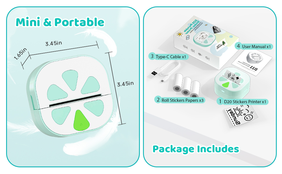 Inkless Thermal Sticker Printer: Using advanced thermal printing technology, this inkless sticker maker delivers sharp, smudge-free prints without ink or toner. Save money and avoid mess while enjoying eco-friendly, high-quality results. The rechargeable battery supports up to a month of regular use.
