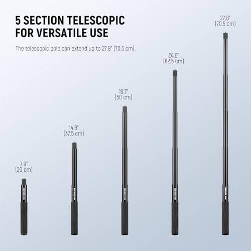 - 【5' Telescopic for Versatile Use】 The telescopic pole can extend up to 27.8" (70.5 cm), allowing for diverse perspectives for capturing group photos, landscapes, vlogs, travel videos, or events like weddings and concerts, ideal as content creator essential and influencer must have. When using your action camera in panoramic mode, the rod will not obstruct the view for more immersive and captivating results