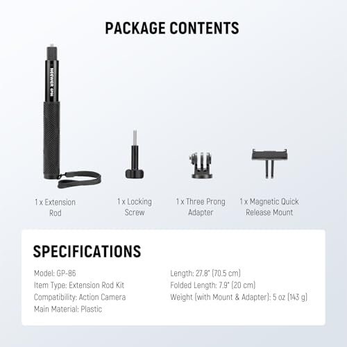 NEEWER Extension Rod Kit Compatible with DJI OSMO Action 5 Pro 4 3 GoPro Insta360 AKASO, 27.8″ Invisible Selfie Stick, Action Camera Adapter & Magnetic Quick Release Mount for Video Recording, GP-86